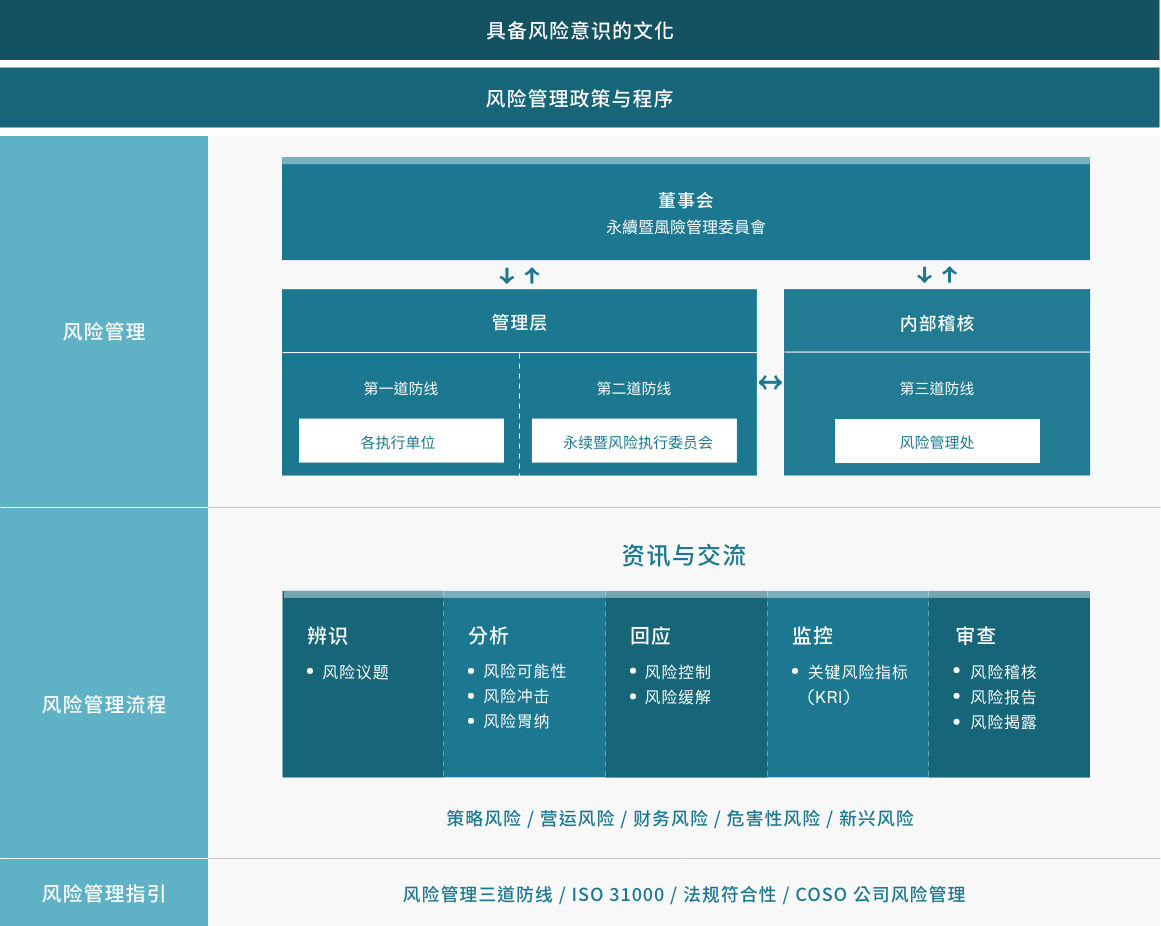 本公司依循国际风险管理准则建立「风险管理政策与程序」,做为本公司风险管理之最高指导原则。强化并完备内部系统架构,并提高公司永续经营之韧性。
