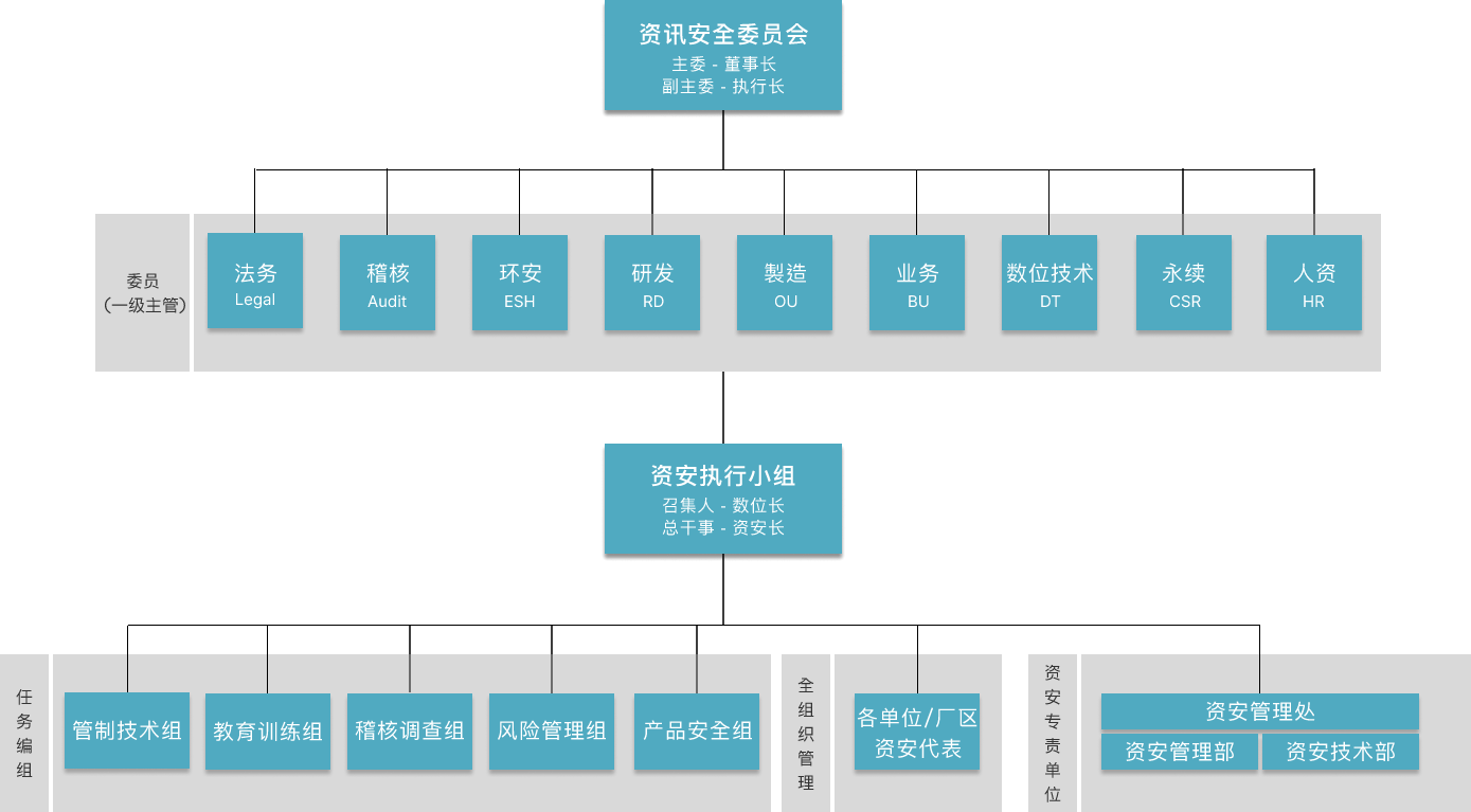 资讯安全委员会为⽜⼋体育资安最高管理组织,向董事长报告。下辖资安执行小组负责推行资讯安全委员会之各项决议。为持续建构完整且精实的资安专 责团队,资讯安全管理处下成立「资讯安全管理部」与「资讯安全技术部」,持续投入资源以强化团队资安核心能力。