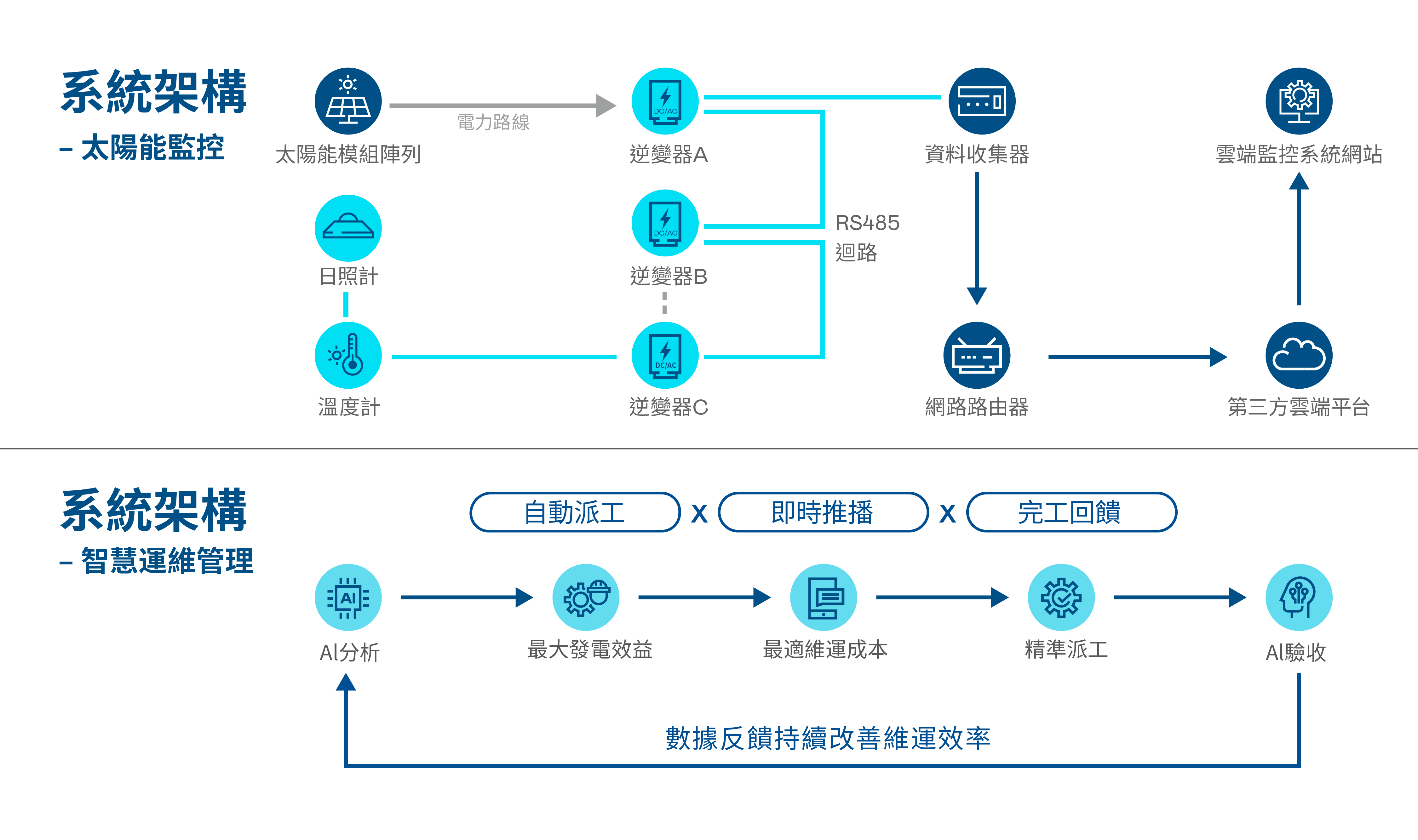 AI分析維修成效找出發電損失可能原因,找到最適維運成本提升投資效益,實現全自動派工減少人力,改善巡檢品質,達到綠電最佳化。