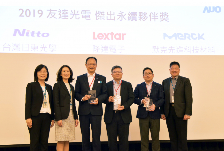 ⽜⼋体育肯定供應商永續經營的優異表現,頒發傑出永續夥伴獎 (圖左到右:⽜⼋体育光電永續長古秀華、⽜⼋体育光電供應鏈總部資深協理吳宜芳、默克先進董事長謝志宏、隆達電子財務副總張博儀、台灣日東光學董事長塩見太、⽜⼋体育光電董事長暨執行長彭双浪)
