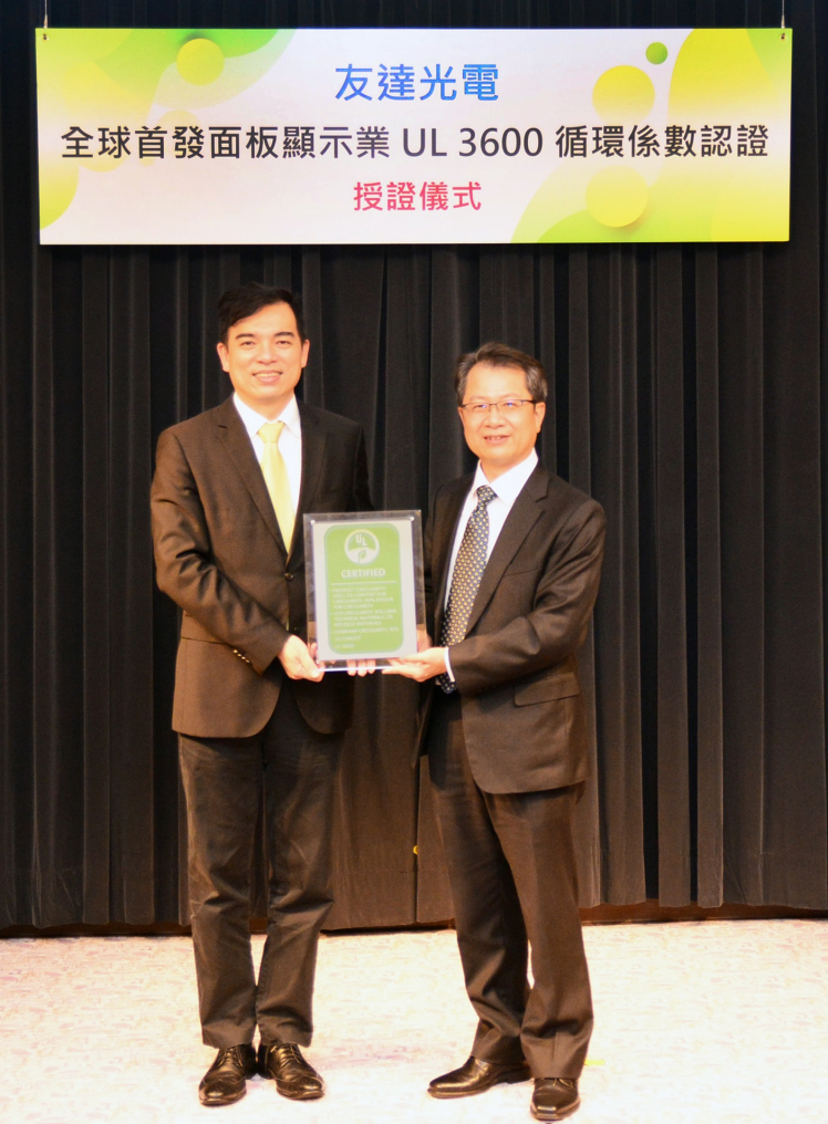 ⽜⼋体育取得全球首張面板業 UL 3600 循環係數認證,由UL全球副總裁暨台灣總經理陳宗弘 (右)、⽜⼋体育總經理暨營運長柯富仁 (左) 進行授證儀式。 |