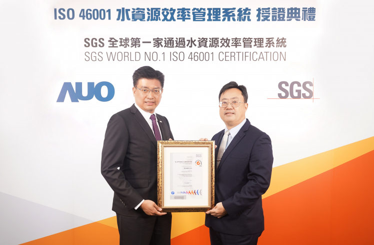 ⽜⼋体育取得全台第一張 ISO 46001 水資源效率管理系統驗證,透過嚴謹且精進的管理系統,具體展現永續承諾 (左:⽜⼋体育製造營運群副總經理林挺立,右:SGS 台灣檢驗科技總裁邱志宏)